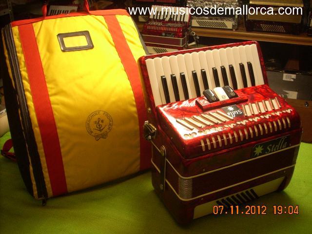 precioso acordeon Marca alemana stella. 48 bajos 26 teclas, 2 voces, 3 registros. mediano tamaÑo, 6 kg. facil manejo. completo con correas y maletin rigido casi nuevo o mochila ( a elegir), regalo curso de acordeon de aprendizaje en dvd. apenas seÑales de uso. funcionando perfectamente, afinado. VIDEO http: //www. youtube. com/watch?v=tYlWhnXs5_U ideal aprendices de cualquier edad. envio contrareembolso MRW GRATIS total formalidad, acepto devolucion visite mi web instrumentos-alcala. es